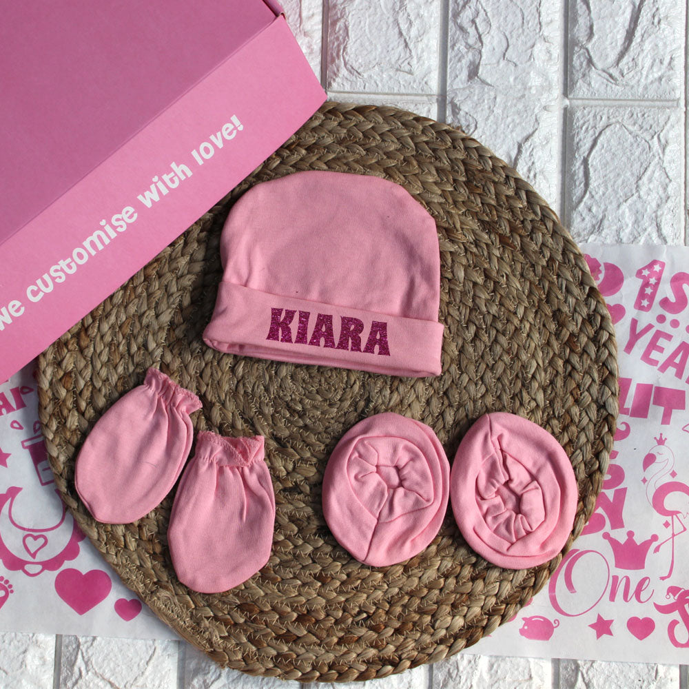 - SET OF CAP, MITTENS and BOOTIES WITH BABY'S CUSTOM NAME.